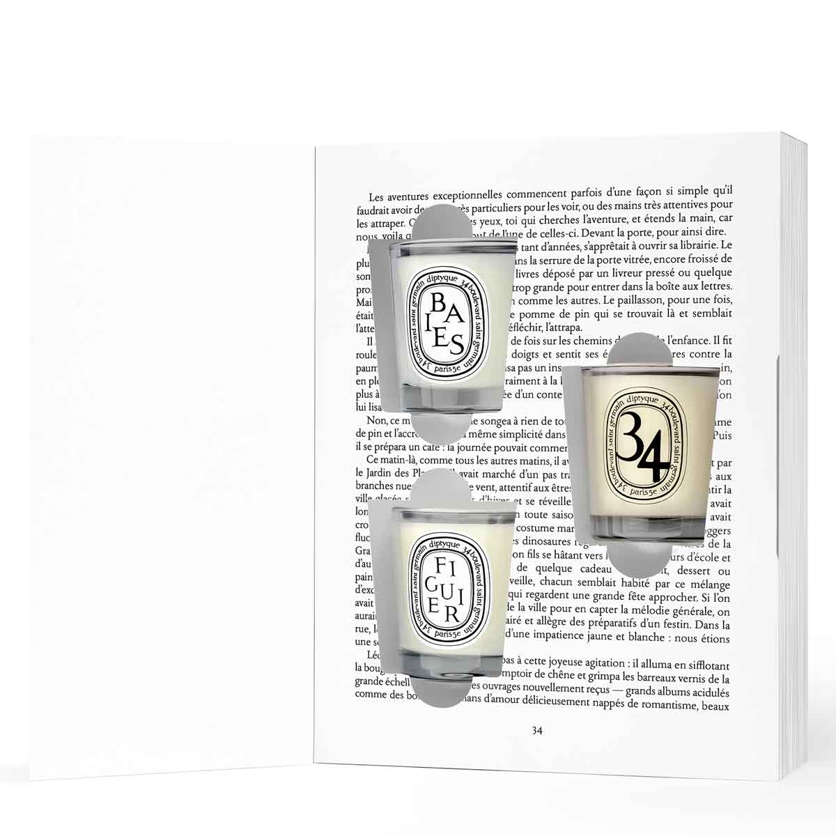 El Diptyque Surprise Book Set 3 Mini Candles es un elegante cofre que reúne tres de las velas más icónicas de la Maison parisina: Baies, Roses y Figuier.