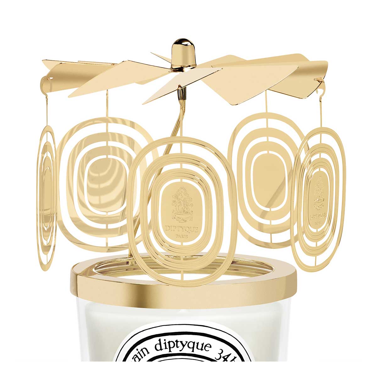 El Diptyque Carousel for Classic Candle es un accesorio exclusivo que convierte cualquier vela clásica en una experiencia visual mágica. Inspirado en los carruseles antiguos, este adorno dorado gira suavemente con el calor de la llama, reflejando destellos de luz y movimiento.