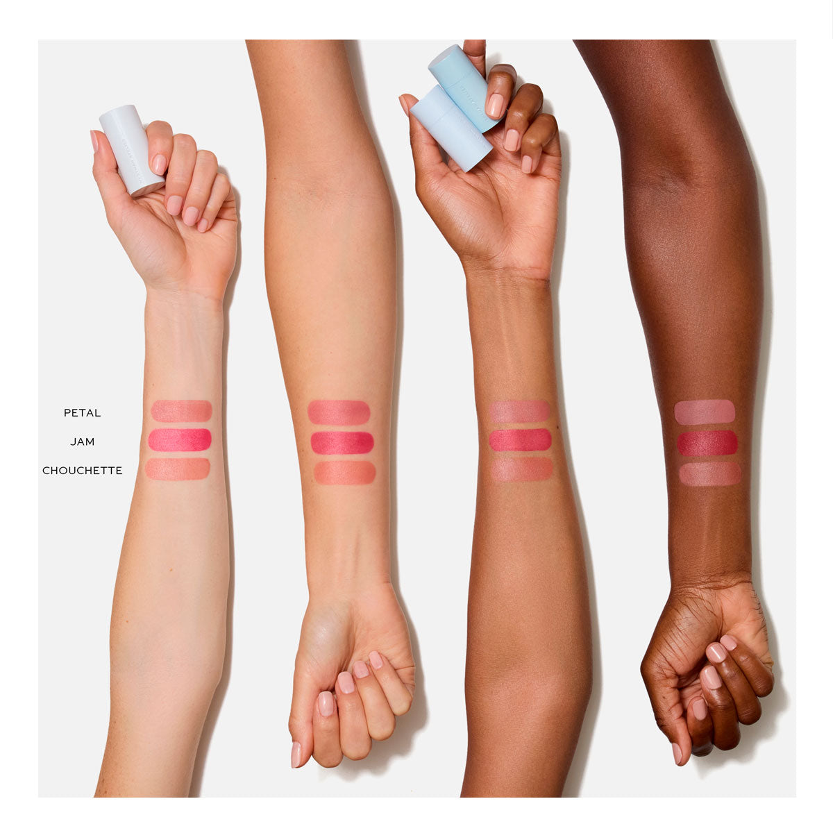 Incluye el tono superventas Petal rosa empolvado, Chouchette melocotón nude y el nuevo Jam, edición limitada, un vibrante rubor en frutos rojos.